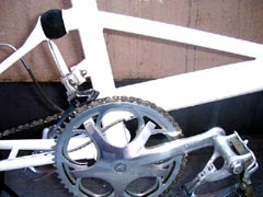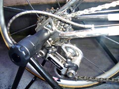 リヤ変速機はカンパレコード リヤは8速です。ローギヤに入れると ディレーラーとのクリアランスが厳しいのと、トップに入れるとチェンがリヤフレームに干渉する時があるが課題です。 |
