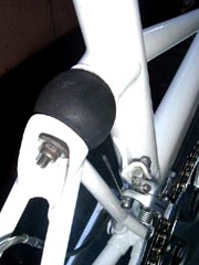 Zefalのポンプの取り付け部分、変速レバーも直付けです。画像では見ずらいですが、ワイヤーガイドも各部きれいに直付けされています。 | スカッシュボールのマウントはフレーム側、リアフォーク側きれいに共作り直されています。リアフォーク全体もワンオフで製作されています。 |