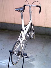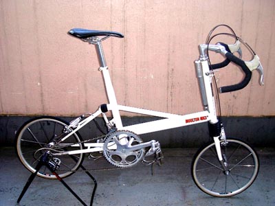 | モールトンFフレームMK3をベースに作成されたスペシャルモデルです。 フレ−ムは細部に渡ってモディファイされ、前後ともフォークはワンオフで製作されています。軽く流してみましたが、17インチチューブラーの為かとても軽快に走ります。色は分かりにくいと思いますがホワイトベースにかるくラメが入っています。全体の印象としては実に丁寧なモディファイがフレームに施されていて制作者の熱意が感じられます。こんなFフレームありかなっと思っています。一見の価値ありです。 |