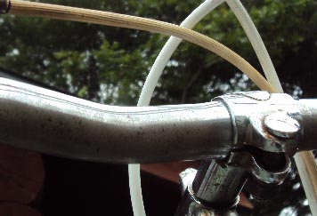 | ヘッドステッカーはオリジナルですが、少し切れています。 | ステム、バー、ブレーキレバーはMK3の物に交換されています。ブレーキレバーは少し錆があります。 きれいに見えるバーのポジションはスピードと同じように反転してあります。 |