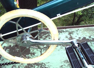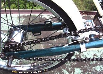 クランク&チェーンリングのメッキはまずまずです。 新品のペダルは雰囲気が合うMSK3000です。 |