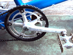 | ブレーキレバーはダイヤコンペ シフターはSAのSRF5専用のもので、カチッカチッと良い感触です。近所の自転車屋さんで390円の物 | チェンリング&クランクはAM2用NERVA、BBはシマノのシールドタイプ(初期ミニはBSC規格)ペダルは車に積み込むことを考えてMSKの脱着式 | リアバブ内装変速機はスターミーアーチャSRF5を使用、リアブレーキは、スイングアームのマウント部分と干渉するので、スイングアーム側を少し削りました。ブレーキの種類によってはクランクやチェーンと干渉したりするので注意が必要です。 |