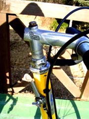 ブレーキはBalilla,ハブはMilremoでどちらもオリジナルです。 | ステム&バーはGB、直付けの変則レバーは、刻印はありませんが、オリジナルかと思います。 |