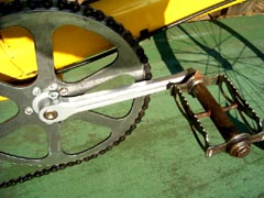 | Dunlop special lightweight のリム、とても貴重かと思います。状態は良い方かと思います。どうしてもMilremoのアルミリムをご希望の場合は、組み換え工賃を御負担頂ければ交換します。タイヤはサイドにヒビが出てきています。 | TA60Tのリング、適度に磨かれています。Milremoのコッタードクランクは、左右とも、シルバーに上塗りされています。オリジナルのペダルにも錆が出ていますが、回転は滑らかです。 | R変速機はもちろんCyclo Benelux P2,作動は正確です。変則アウターワイヤーはリブ無しの現行品です。 |