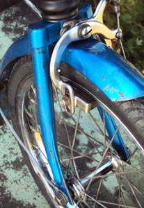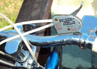 | オリジナルのヘッドマークは少し剥がれがあります。 | フロントブレーキ、ハブ、リム共にメッキ良好です。 | バー、ステム、ブレーキレバーメッキ良好ですが、ステムのMOULTONのロゴは2度押しされています。これも味があります。 |
