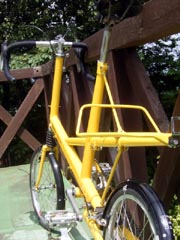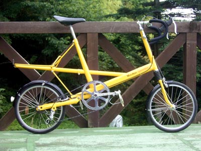 | 1965年モールトンFフレーム Speedsixのアップグレード仕様です。ベースは、オリジナル スピード6の初期タイプです。塗装は、再塗装です。オリジナルイエローの近似色で、英国バックヤードビルダー的仕上がりです。オリジナルの雰囲気を損なう事なく、クランク、ホイル、ディレイラー等を上質なものに交換して、性能を向上させています。試乗した感じは、やはり、かなり快適に仕上がっています。また、モールトンリムを採用しているので、ガンガン走っていただけると思います。各部、油脂類交換、整備調整済みですが、タイヤは、交換時期かと思います。 |