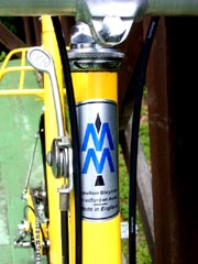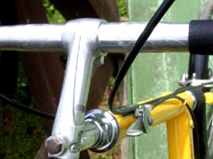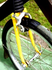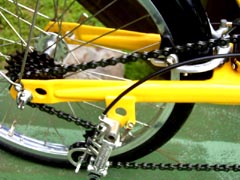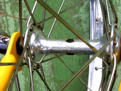 | ハブは、カンパレコード、リムは、モールトン17" オリジナルと同じように、クロスで組まれています。ほぼ新品です。 | ステム&バーは、GBですが、バーは、刻印入りの物が装着されています。 | TA60t(ほぼ新品)にストロングライト49Dが組み合わされています。ペダルは、リオターとなっています。 ワイヤーガイドは、破損しやすいプラスチック製から、直付けに変更されています。 |