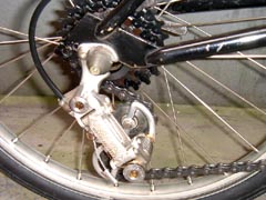 リヤディレイラーはNUOVO RECORD パーツはすべてフランス製と思っていたのですが、手持ちがあったのでこれを使用、レバーもカンパバーコンだからいいかな。 6速のフリーはノルマンディ、14t〜24tと54tチェンリングでは私の非力な脚力でも物足りません。 |