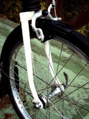 | ヘッドバッチは、年期が入っています。 | AM5に装着されていたホイルを 60年代風にクロスに組み換えました。ハブはカンパ、ブレーキはAM2用のワインマンです。 |